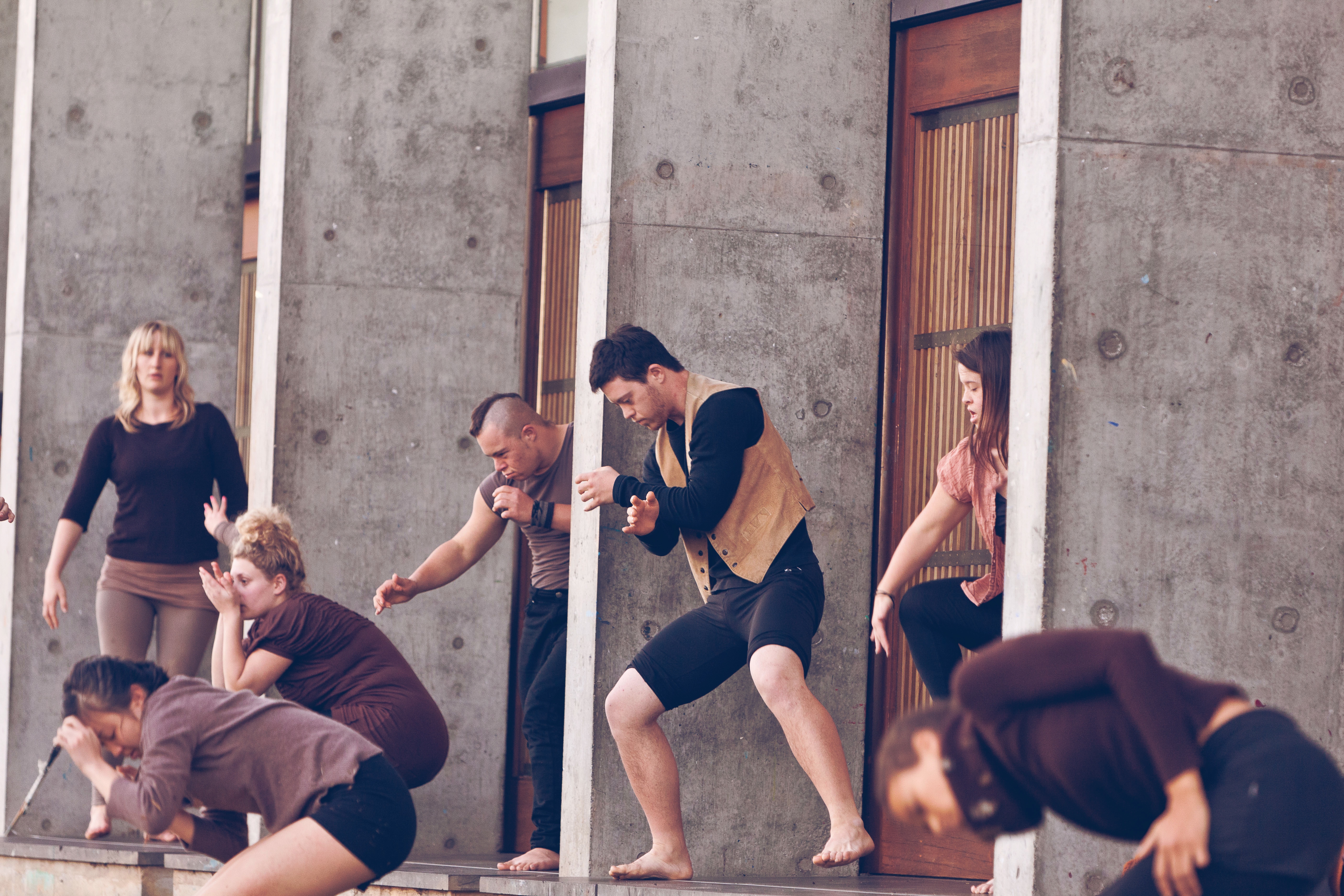 The dancers working in the ensemble group consisted of Lyn Cotton, Alys Webster, Duncan Armstrong (NZ), Ali Phillips, Alexandra Cerullo, Sam Leahy (Qld), Zachary Mifsud, Maxamillian McCauley, Sara Tinning, Alexandra Fincher, Ashley Kuhle, Christopher Bunton, Digby Webster, Zahra Smith, Chanel Leaudais, Tanya Voges (NSW), Bhenjamin Radburn, Shuling Wong (WA). The audience met them firstly on the outside of the BEC building where they entered one by one to rest in separate bays. Here they then showcased their solos and ensemble work which was inspired by a barefoot silent creek walk experience. After the dancers disappeared back into the building one by one, the audience then entered the BEC to witness other smaller group work before they learnt more about the process during the past few days.
