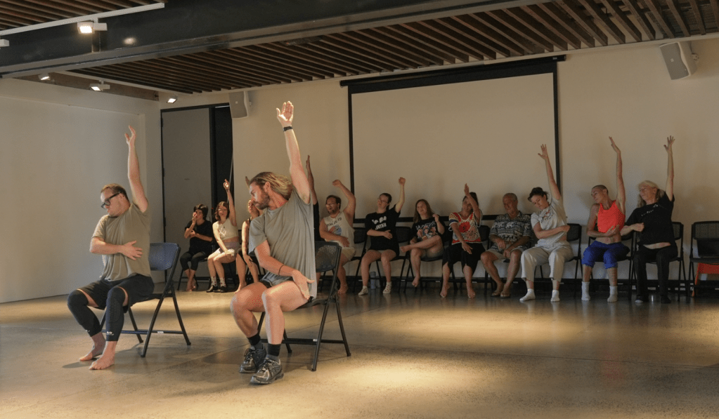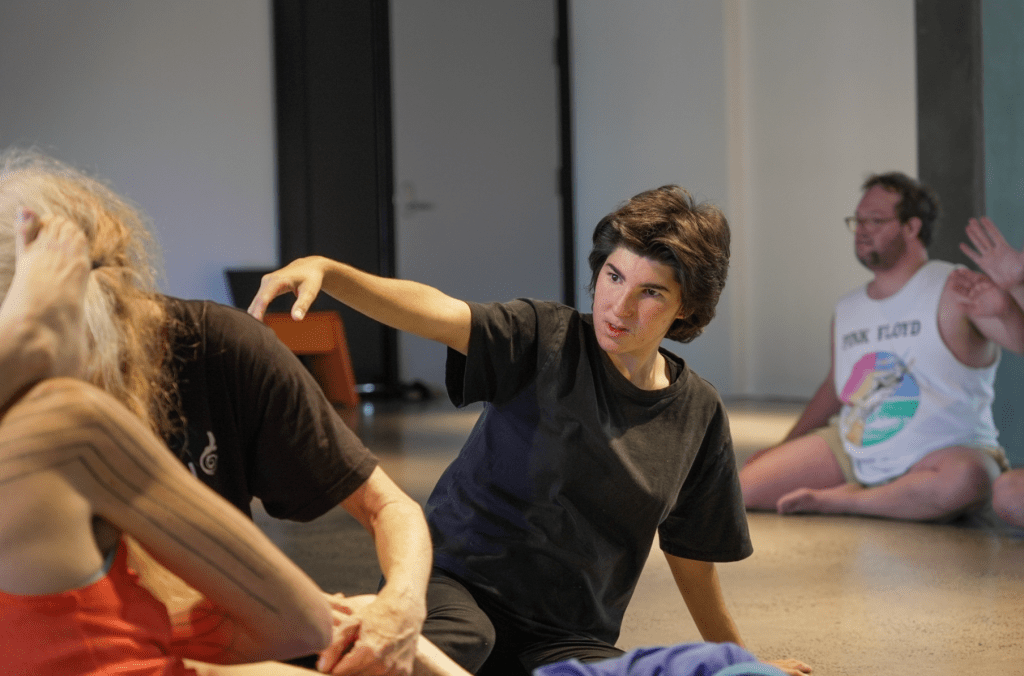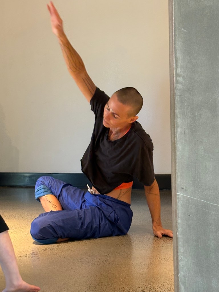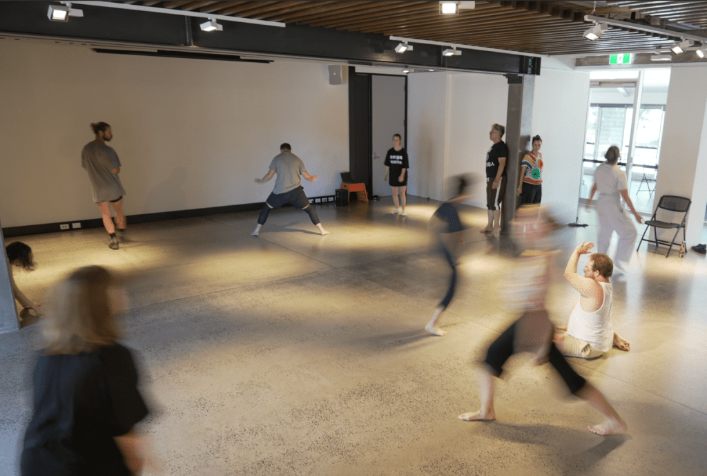 The morning began with Impulse and Form, facilitated by Golden Thursdays’ Bryn James and Stuart Shugg, with support from ensemble members. This session also marked the very first public workshop connected to the research and development of Scenes from a Lake, ahead of their upcoming three-week residency with GUTS Dance in Alice Springs, and professional development workshops soon to follow at Centre National de la Danse (CND), Paris, and PARTS in Brussels.